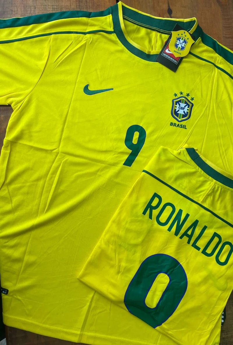 A Camiseta Retrô da Seleção Brasileira 1998 com o nome do Ronaldo Nº 9 representa uma era inesquecível, onde o Fenômeno dominava o mundo com sua velocidade, talento e presença dentro de campo.