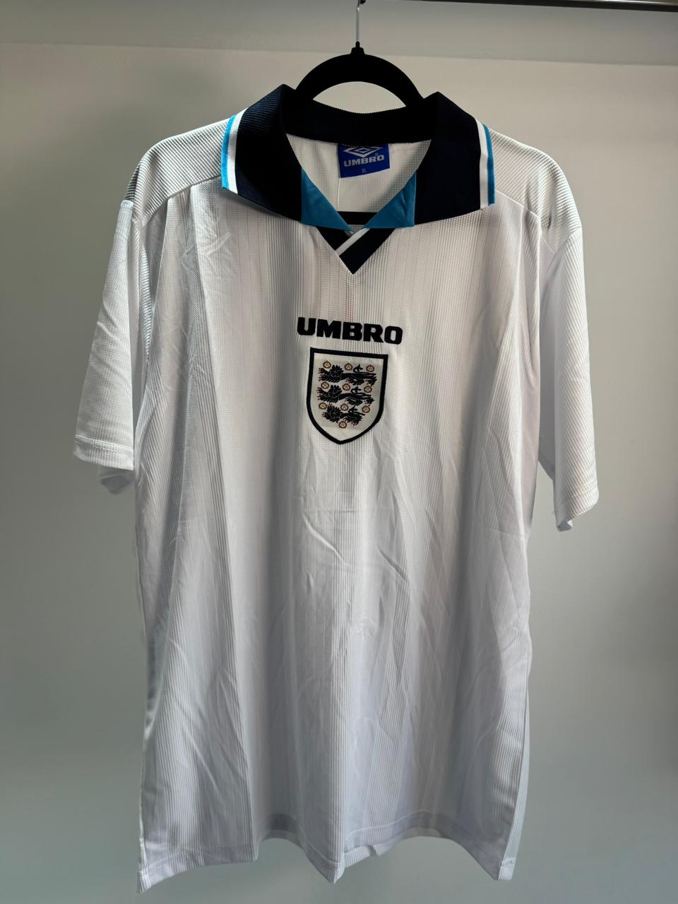 A Camiseta Retrô da Inglaterra 1996 carrega o espírito da Euro 96, com um design clássico que mistura tradição, identidade e um toque marcante nos detalhes.